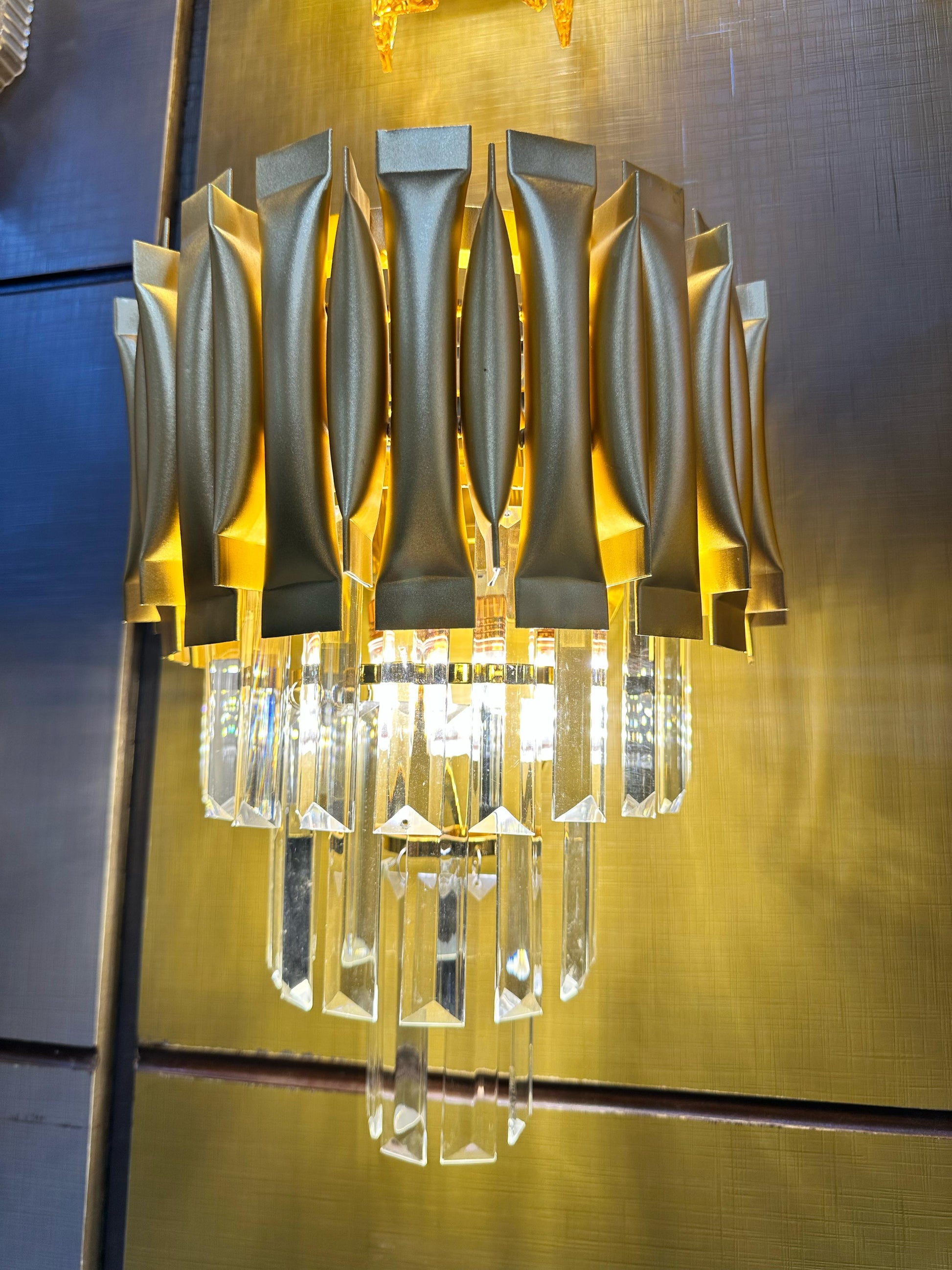Add a bold statement to your walls with the Crystal Wall Light — a perfect fusion of modern design and classic elegance. The top portion features a unique matte metallic gold and bronze wave pattern, giving it a rich and luxurious texture. The bottom is adorned with layered clear crystal prisms that catch and reflect light beautifully, adding sparkle and depth to your room.